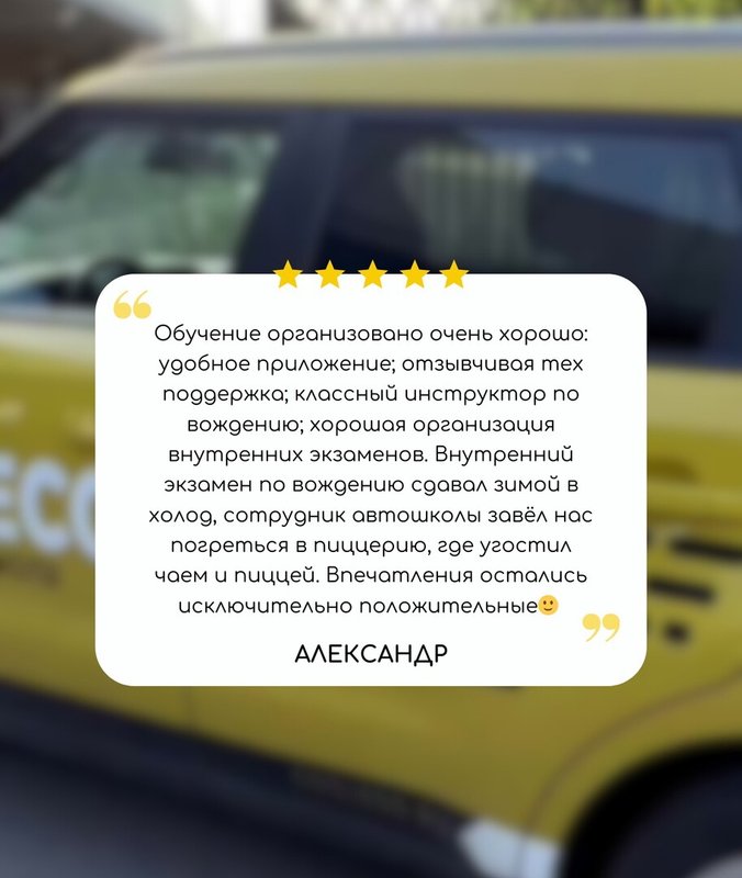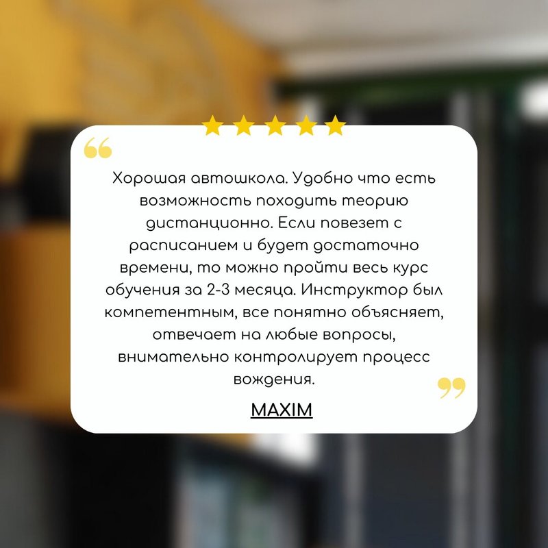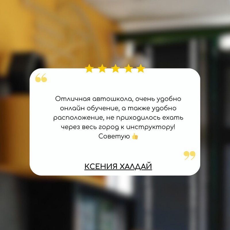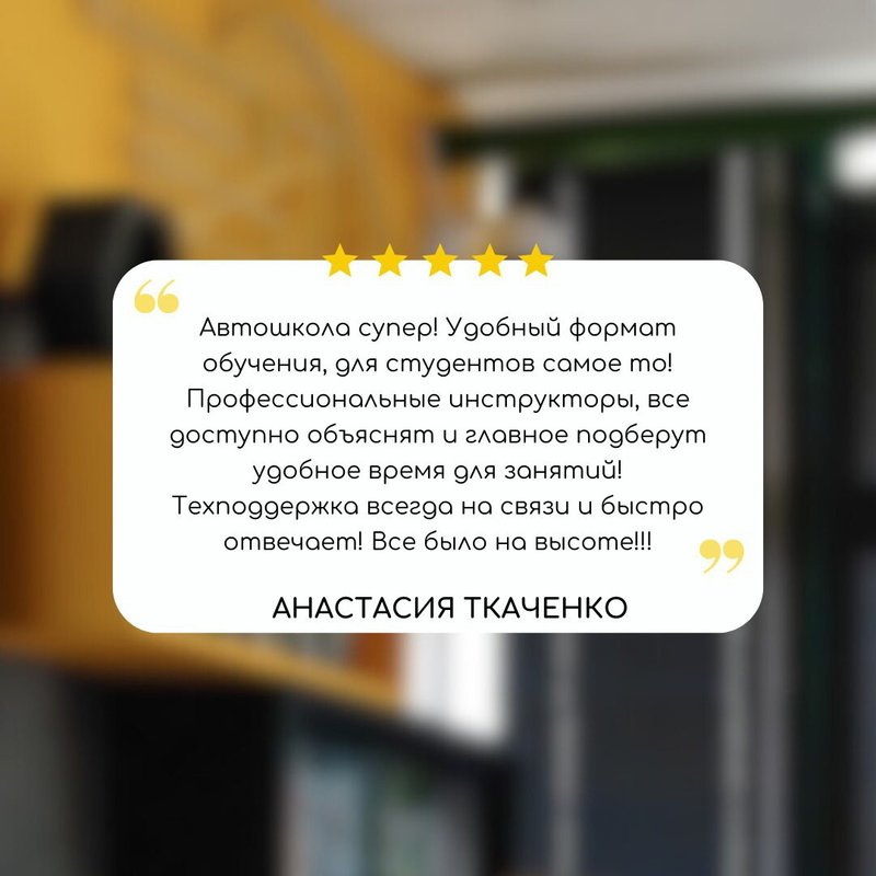 Автошкола моей мечты!) Это действительно так, ведь были воплощены все мои запросы! Теория онлайн? Да) Актуально и максимально удобно! Занимаешься тогда, когда есть свободное время. Онлайн-уроки максимально понятные, короткие и конструктивные. Когда дело дошло до практики, моему восторгу не было предела! У меня лучший инструктор!) Полная противоположность всем тем, которыми часто пугают! С меня никто не требовал доп вложений, не было предложений купить права и тп... Инструктор - женщина! (идеально для девушки, как мне кажется. Ведь кто поймёт нас лучше?..😉) Учит свободному и уверенному вождению по городу! Рассказывает и объясняет ВСЁ!