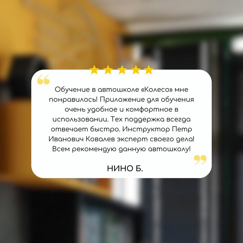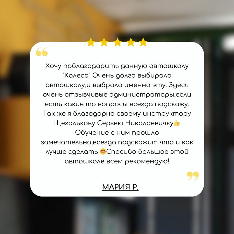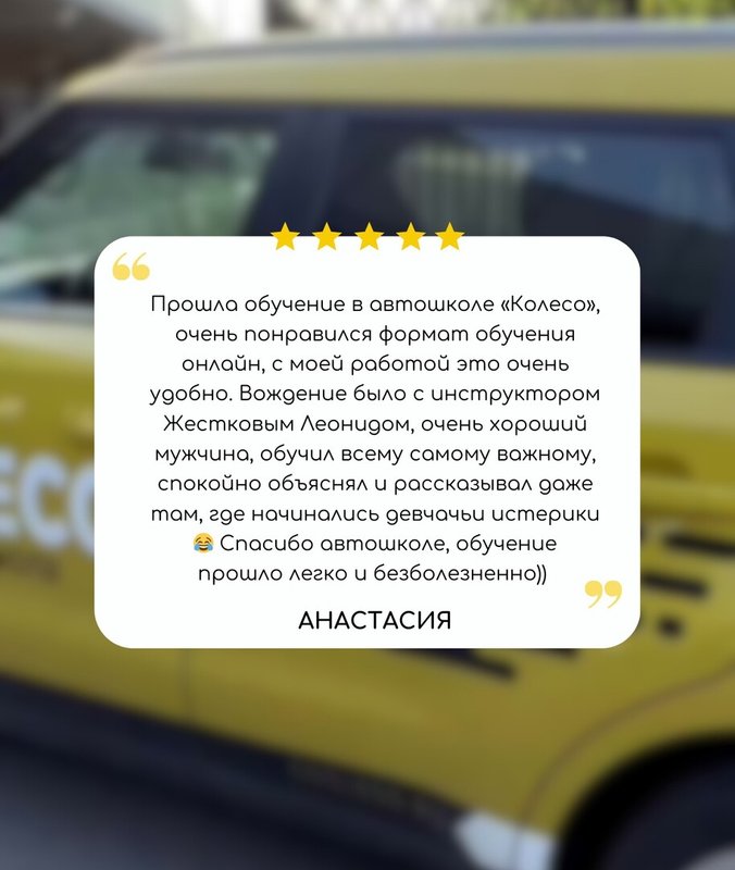 Огромное спасибо автошколе Колесо за бесценный опыт и невероятно крутых инструкторов! Посчастливилось поучиться у двух инструкторов и это было нереально круто, спасибо! Так же рекомендую и буду рекомендовать автошколу Колесо близким и друзьям!☺️👍
