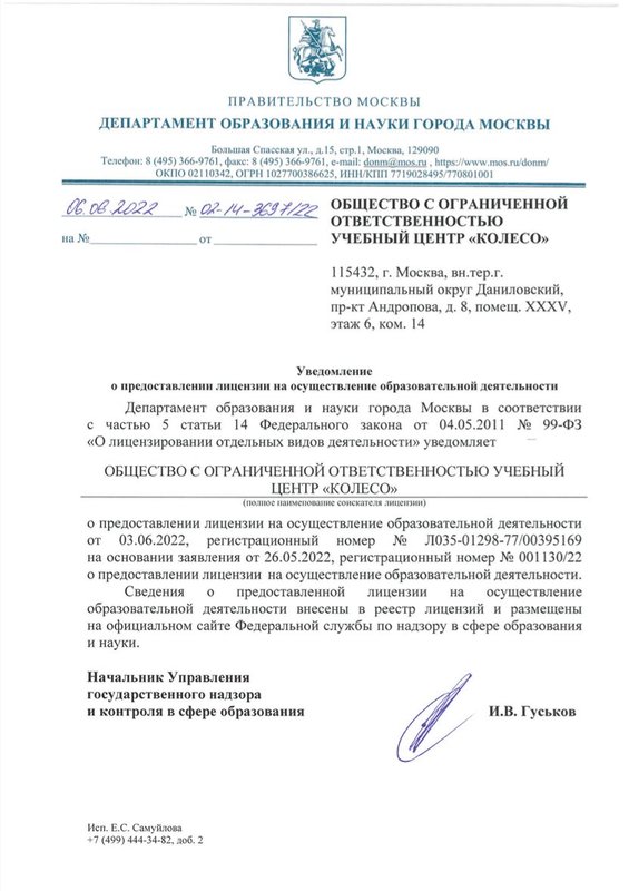 Преимущества: Хочу выразить благодарность автошколе «Колесо». Очень понравился формат занятий, а именно: теоретические занятия можно проходить в любое время и в любом месте в удобном и понятном приложении, а практические занятия удобны тем, что место подбирается индивидуально (поближе к дому). Такой формат экономит время и силы. Большое спасибо!